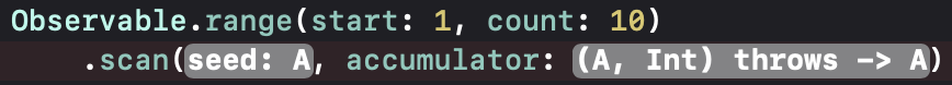두 번째 파라미터로 전달할 수 있는 형식은 두가지다. 첫 번쨰는 클로저, 두번째 파라미터는 옵저버블이 방출하는 항목의 형식과 같다. 그리고 클로저에 리턴형은 첫번째 파라미터와 같다. scan연산자로 전달하는 클로저는 Accumulator Function 또는 Accumulator Closure라고 한다. 기본값이나 옵저버블이 방출하는 항목을 대상으로 Accumulator Closure를 실행한 다음 결과를 옵저버블로 리턴한다.