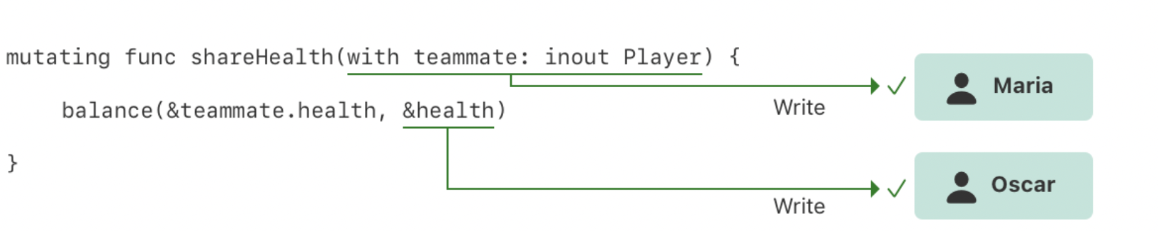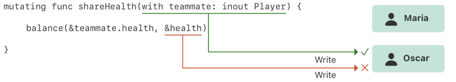 oscar.shareHealth(with: &oscar) // Error: 단일 주소에 접근